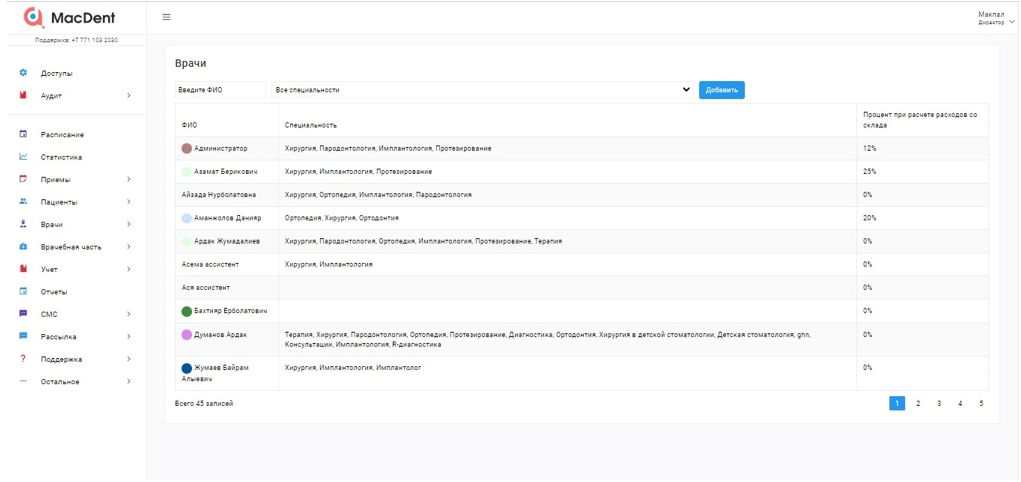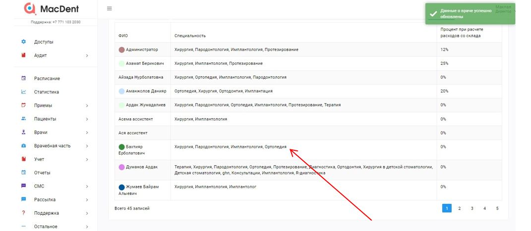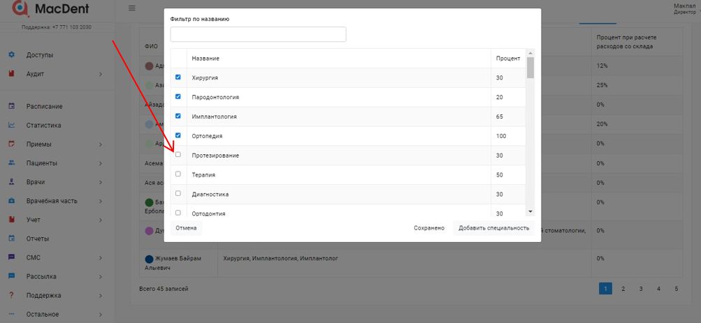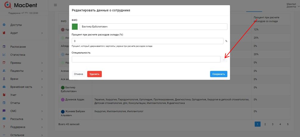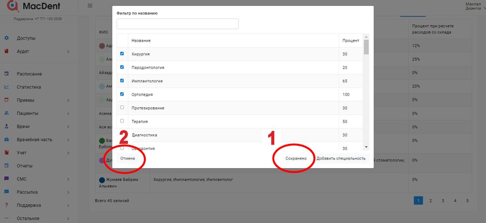 В вышедшем окне напротив каждой специальности проставляете процент врача и нажмите на кнопку СОХРАНИТЬ