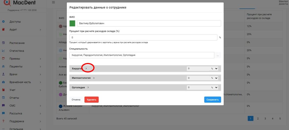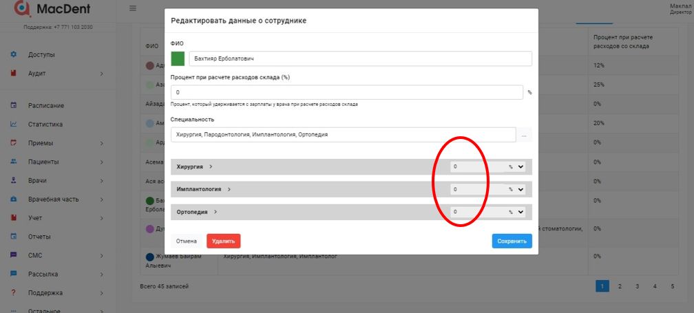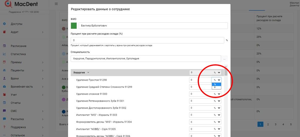 Нажмите на врача, которому хотите выставить процент